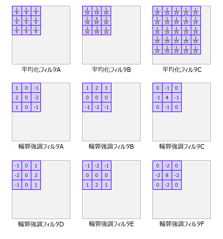 カーネルとは、この変換方式で使用する係数のことで、サイズは3x3画素、5x5画素、7x7画素などがあります。