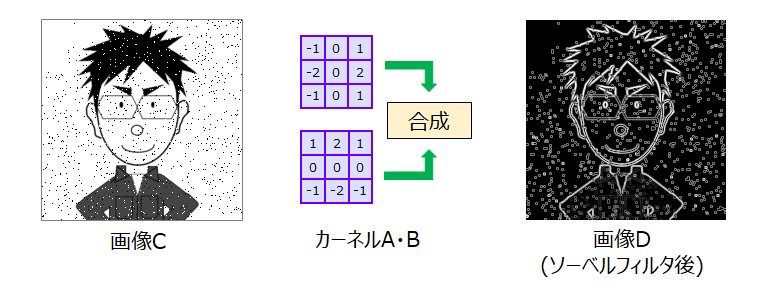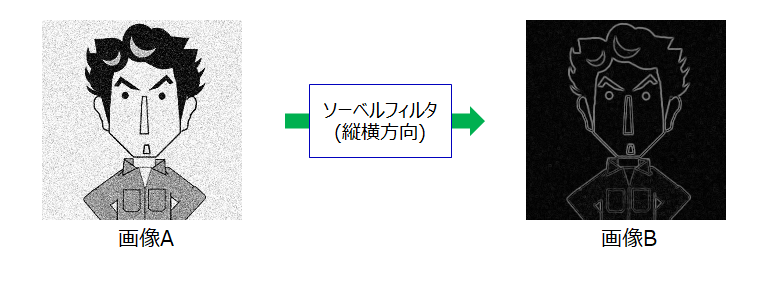 ソーベルフィルタは、「画像B」のような小さいノイズであればノイズを除去しながら綺麗に輪郭を抽出することができます。