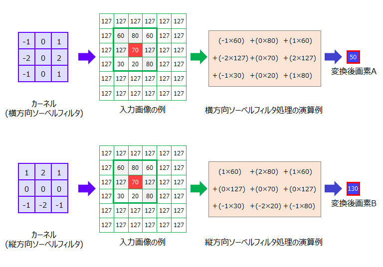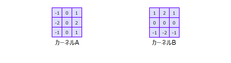 「カーネルA」は横方向、「カーネルB」は縦方向のエッジを強調します。