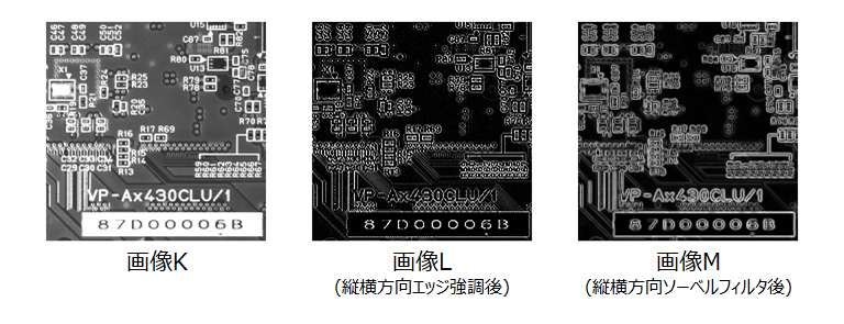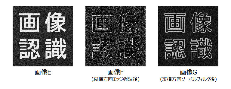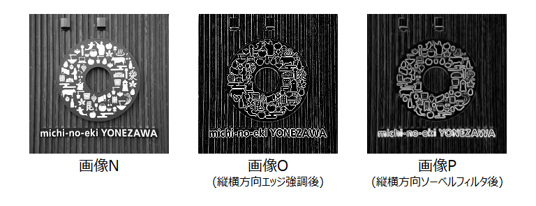 「画像F」「画像I」「画像L」「画像O」は以前に紹介した縦横方向のエッジ強調フィルタの結果で、輪郭と一緒にノイズが残ってしまっていることがわかります。