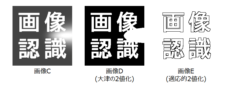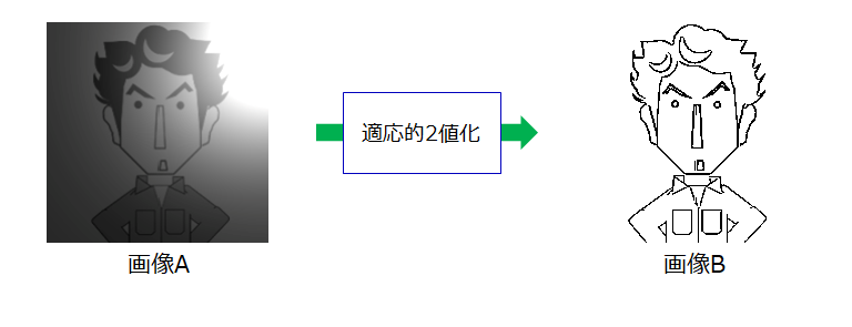 適応的2値化は、2値化しきい値を画素ごとに求める手法で、部分的に明るさが変化するような画像でも最適に2値化処理をすることができます。3記事目と4記事目で紹介した2値化処理では画像1枚で1つのしきい値を使用しましたが、適応的2値化では画素ごとにしきい値を算出します。