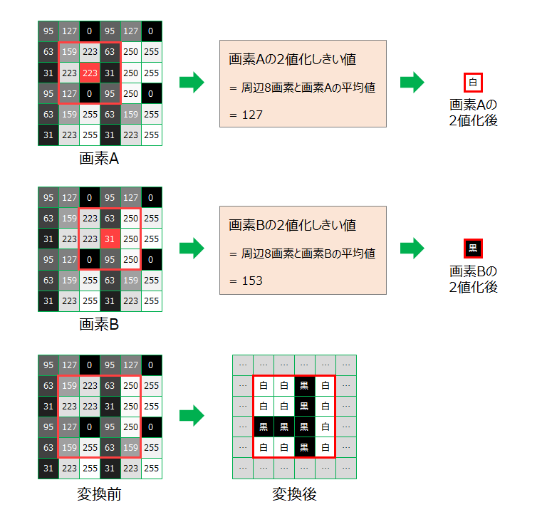 適応的2値化は、変換画素と周辺画素の画素値の平均値を2値化しきい値とします。画素Aのしきい値は周辺8画素と画素Aの平均値=127です。画素Aがしきい値127より大きいことから、結果は白(255)です。同様に画素Bのしきい値は153です。画素Bがしきい値153より小さいことから、結果は黒(0)です。この演算を画像の全画素に対して行います。