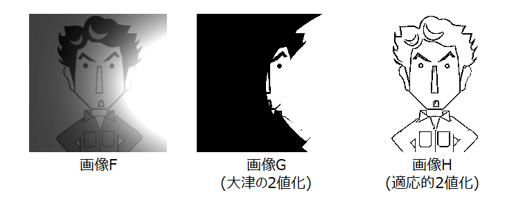 「画像H」ではスポットライトを浴びた男前の顔がつぶれることなく見事に2値化されてますね。