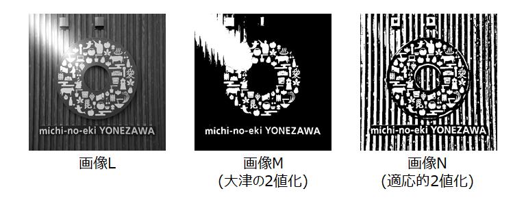 明るさが変動する画像の場合、大津の2値化ではうまく処理できませんが、適応的2値化では最適に処理できています。