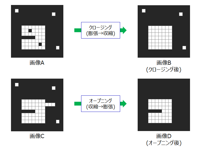クロージングとオープニングは、2値画像に対して前回の記事で紹介した膨張処理と収縮処理を複数回行う処理です。