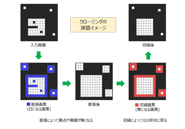 クロージングは、2値画像に対して数回の膨張処理を行った後、膨張処理と同じ回数の収縮処理を行う処理です。黒いノイズや黒い線を消すことができます。