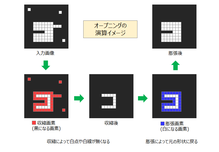 オープニングは、収縮後に膨張を行う処理で白いノイズや白い線を除去できる