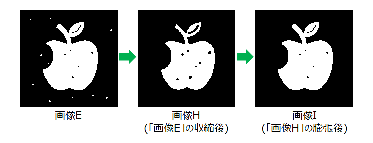 図は収縮と膨張をそれぞれ1回ずつ組み合わせたオープニング処理の演算イメージです。