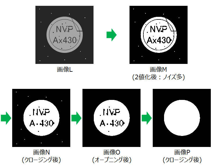 ノイズが多かった「画像M」がクロージングとオープニングを組み合わせたことでノイズ成分が除去され、綺麗な2値画像「画像P」に変換できました。