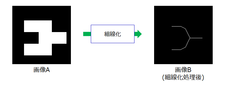 細線化は、2値画像の白画素領域を外側から削って、幅1画素の線画像に変換する処理です。