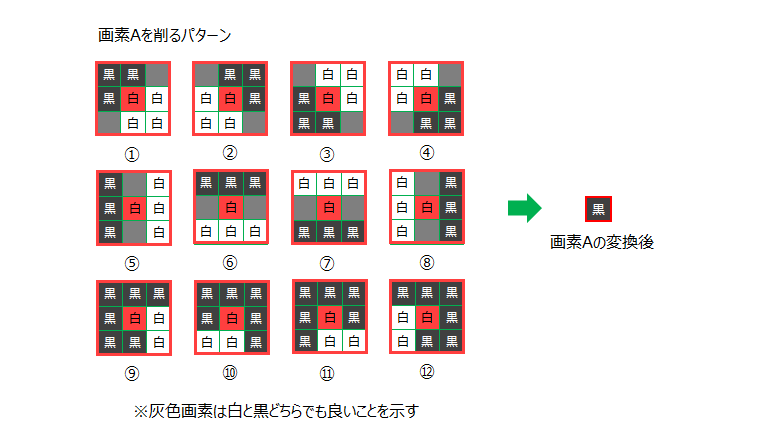 画素A(赤色)が対象画素の場合、削るパターンのどれかに一致すれば、画素Aを黒に変換します。