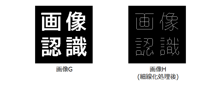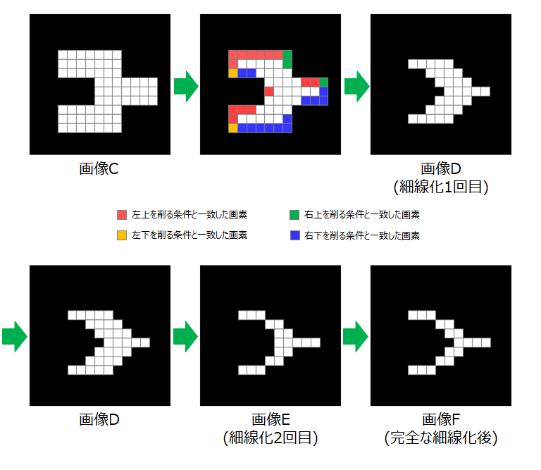 「画像C」を細線化できなくなるまで繰り返すと、最終結果は「画像F」になります。