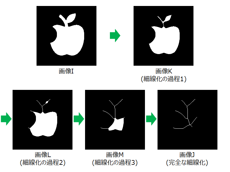 「画像I」を細線化できなくなるまで繰り返した結果が「画像J」です。「画像J」までの過程を見てみましょう。