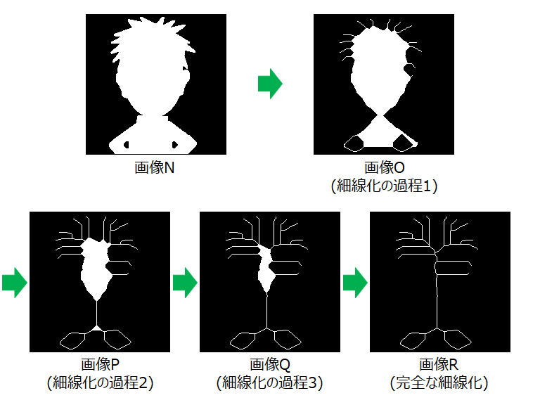 「画像N」を細線化できなくなるまで繰り返した結果が「画像R」です。「画像R」までの過程を見てみましょう。