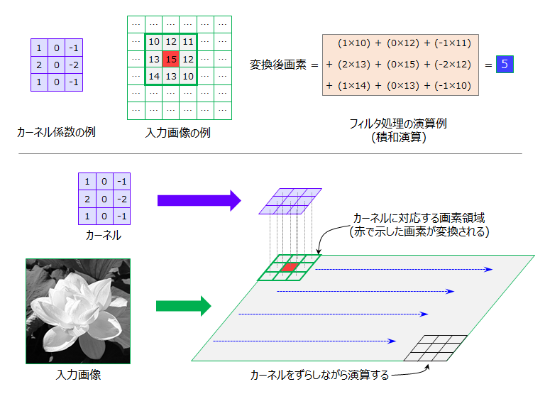 カーネル係数と入力画素をかけ算・足し算(積和演算)した値が変換後の画素値となります。