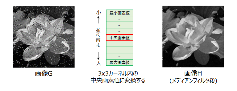 積和演算を使用しないフィルタ処理として、最小値・中央値・最大値フィルタがあります。