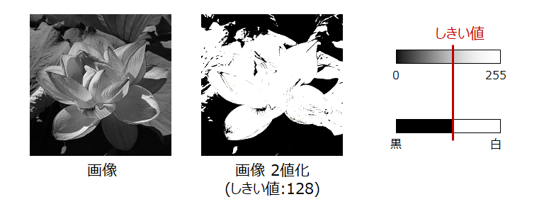 2値化とは、画像を白と黒の2色に変換する処理のことです。ある値以上の画素値を白、ある値未満の画素値を黒に変換します。このある値をしきい値と言います。2値化は画像を単純化するので、画像検査などで物体の検出を行う際の前処理として良く使われます。