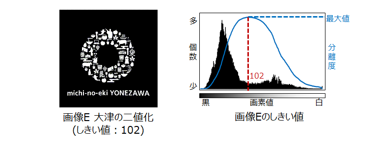 画像のヒストグラムから、画素値の分布を黒と白の領域に分ける分離度を求め、分離度が最大の時の画素値を2値化しきい値とします。