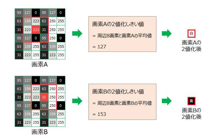 変換画素と周辺画素の画素値の平均値を2値化しきい値とし、この演算を画像の全画素に対して行います。