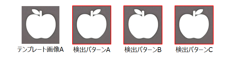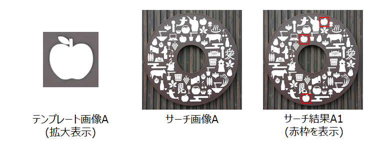 まずは「サーチ画像A」から「テンプレート画像A」のようなリンゴの絵を探してみます。