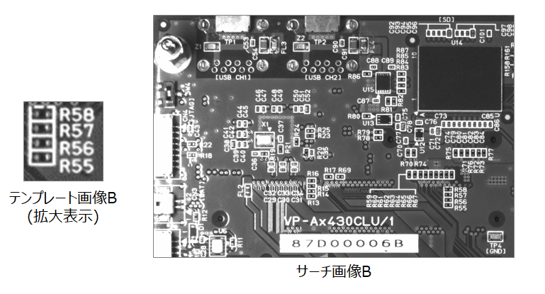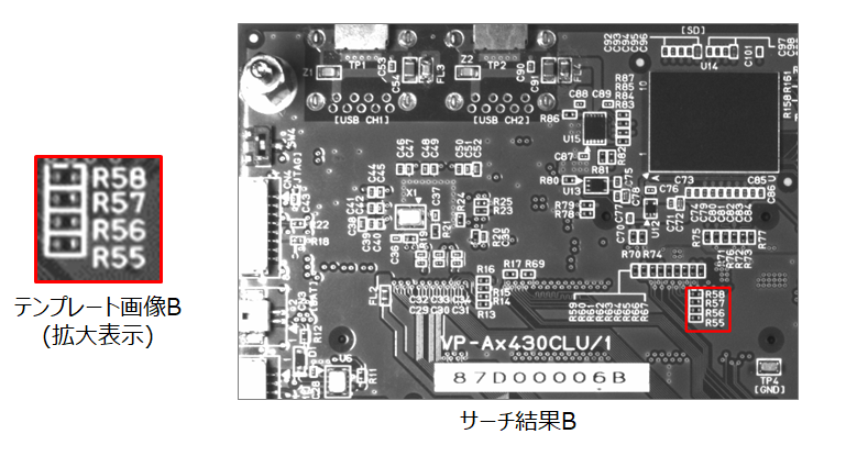 一致度(類似度)が95%以上で、基板上の「テンプレート画像B」と同じ部分が見つかりました。