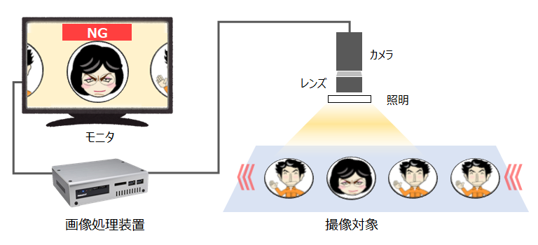 画像検査システムは、カメラ、レンズ、照明、画像処理装置、モニタなどで構成されます。