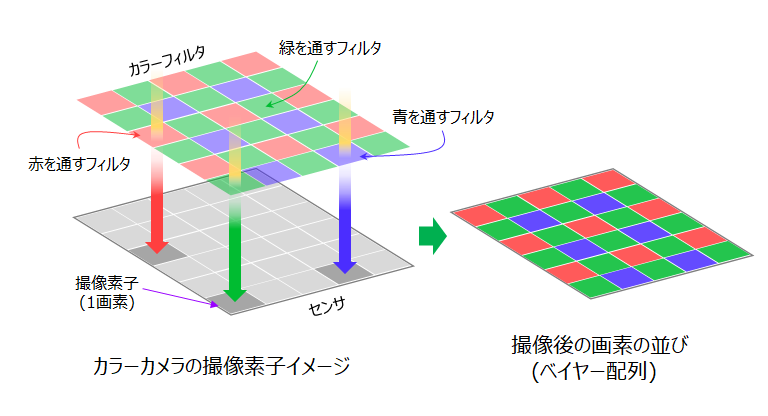 カラーカメラでは、撮像素子の前にカラーフィルターが配置されています。