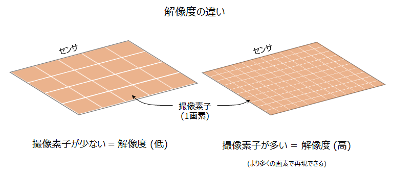 撮像素子に配置された1つの受光素子を画素といいます。解像度は、この画素の総数です。