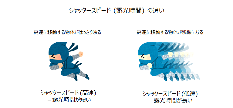 撮影する時に受光素子に光が当たっている時間をシャッタースピード(露光時間)といいます。