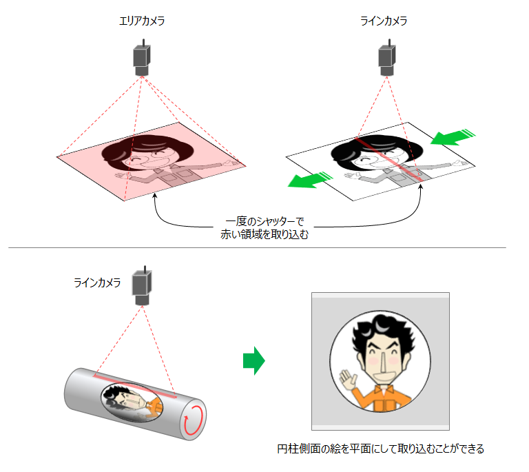 カメラのスキャン方法には面を撮影するエリアカメラ(一般的な方法)、ラインごとに撮影するラインカメラがあります。