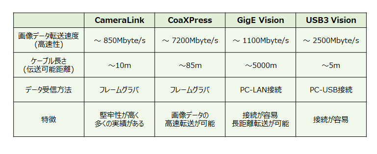 産業用カメラのカメラインタフェースとして、CameraLink、CoaXPress、GigE Vision、USB3 Visionなどがあります。