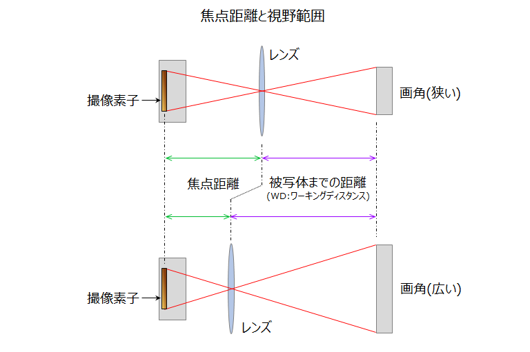 焦点距離とはレンズ中心から撮像素子までの距離です。産業用レンズでは8~50mmぐらいがよく使われます。