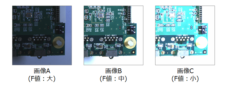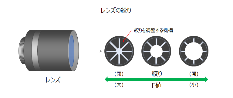 レンズの絞りとは、光の量を調整する機構でF値ともいいます。F値が小さいほど多くの光を通す為、明るい映像になります。