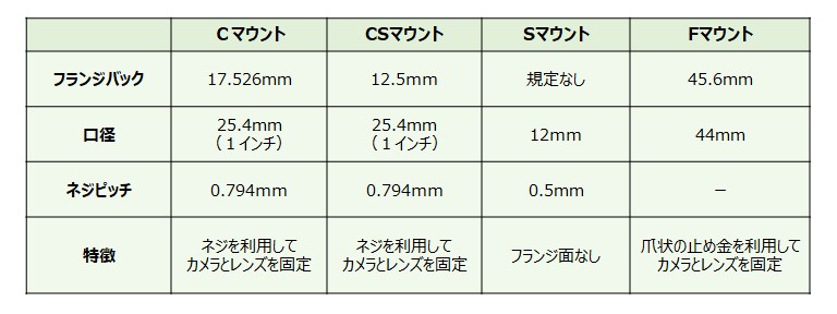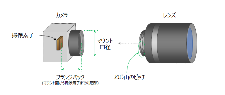 カメラとレンズを接続する機構をマウントと呼び、各寸法と形状の違いでCマウント・CSマウント・Sマウント・Fマウントなどがあります。産業用カメラで良く使用されるのはCマウントです。