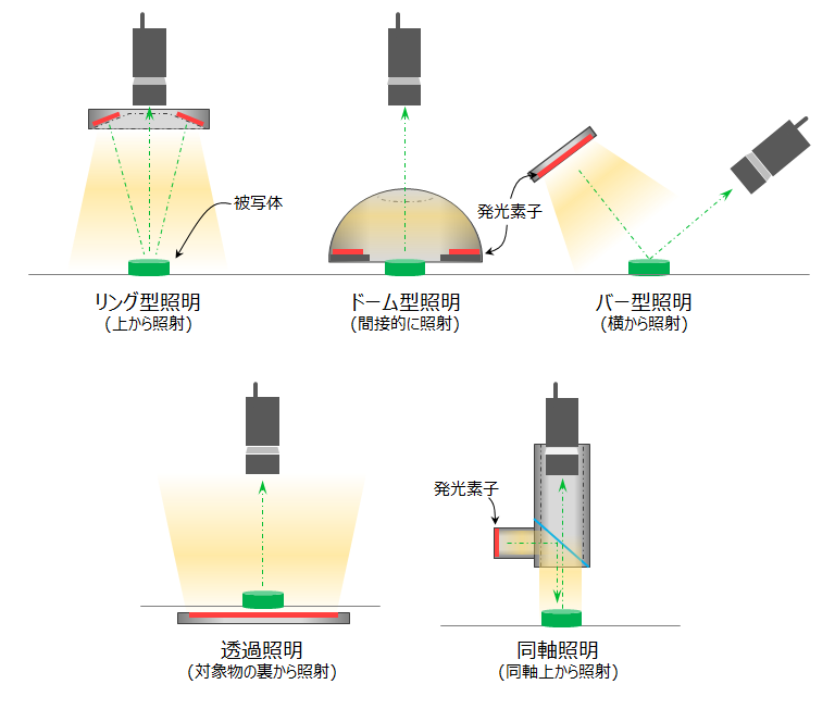 照明はリング型、バー型、ドーム型など様々な形状があります。照射方法は検査対象物の下から照射する方法、横から照射する方法、レンズの同軸上から照射する方法などがあります。レンズの同軸上から照射する照明を同軸照明と呼びます。