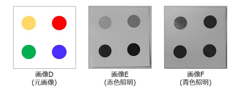 「画像D」のような色のついた対象に赤色照明、青色照明を当てて撮影してみます。