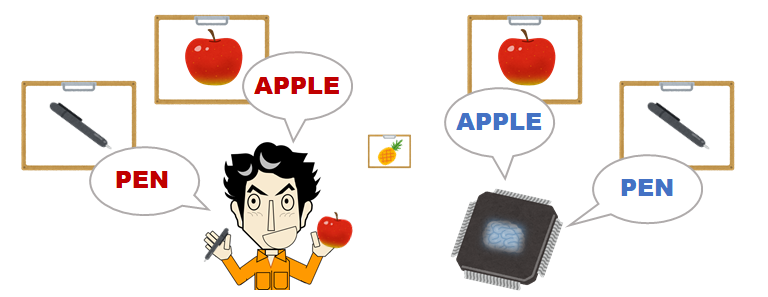 例えば、ペンとアップルを見分ける方法(知識)をコンピュータに教えて学習させることで、アップル・ペン識別AIができあがります。