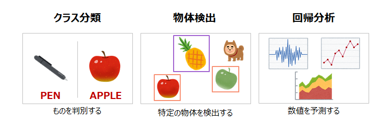 図はAIでできる処理の例で、クラス分類や物体検出、回帰分析以外にも様々なものがあります。