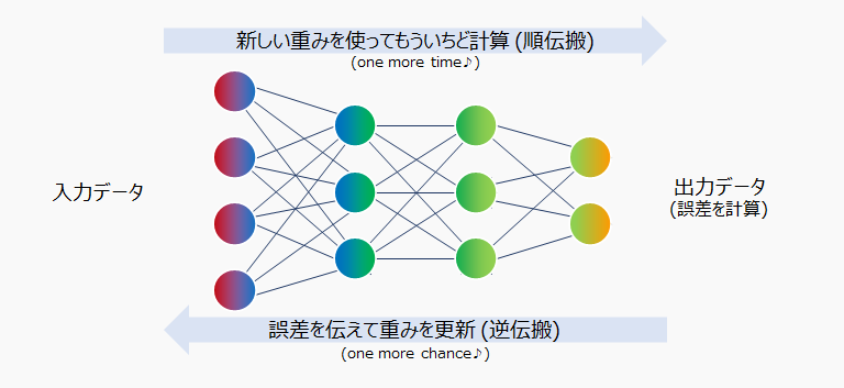 ニューラルネットワークによる学習では順伝搬と逆伝搬を行います。