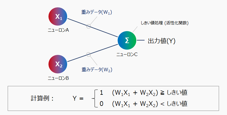 例えば、ニューロンCに情報を伝える場合、ニューロンAの出力値と重みデータ、ニューロンBの出力値と重みデータを計算します。