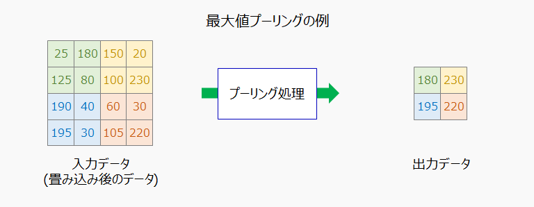 プーリングとは次に伝える情報を圧縮する処理で、最大値を抽出するものや平均値を抽出するものがあります。