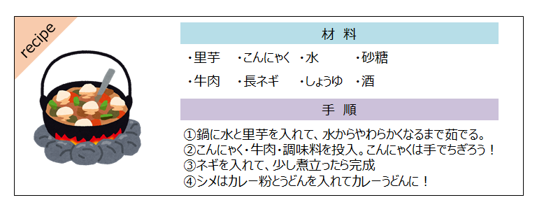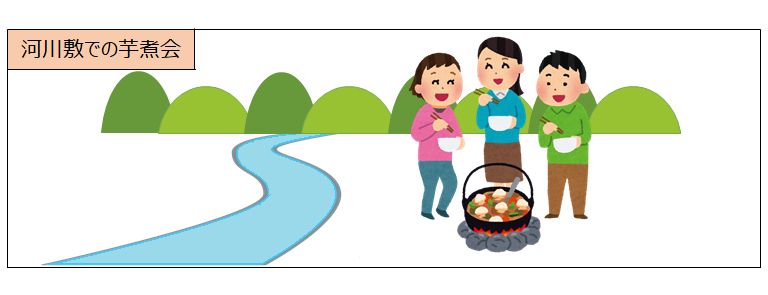 秋は、河川敷で芋煮の鍋をかこむ「芋煮会」が風物詩よ。スーパーでは鍋や薪などをレンタルもしているわ!