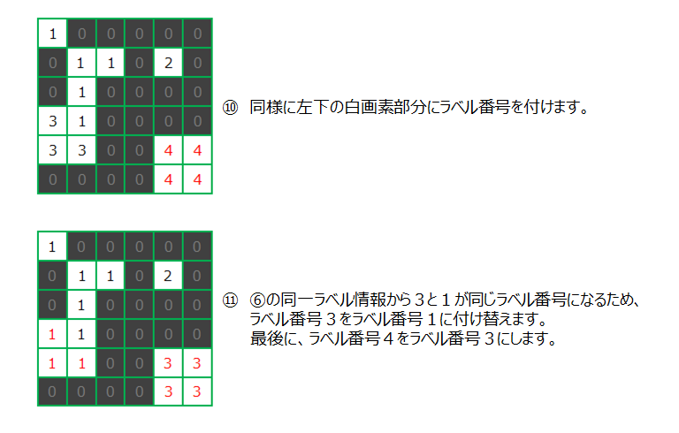 ラベリングは、2値画像の左上から右下に向かってラベル番号を付けていきます。