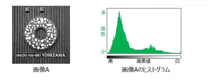 まず、ヒストグラムとは横軸に画素値・縦軸に画素値の個数をとり、画素値の個数を棒グラフにしたもので、画像の特徴を解析するために使用されます。ヒストグラムの詳細は、また別の機会に説明します。