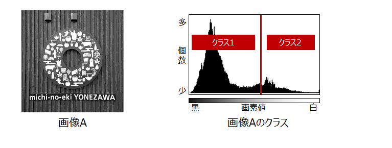 画素値に対して、左側をクラス1・右側をクラス2とします。