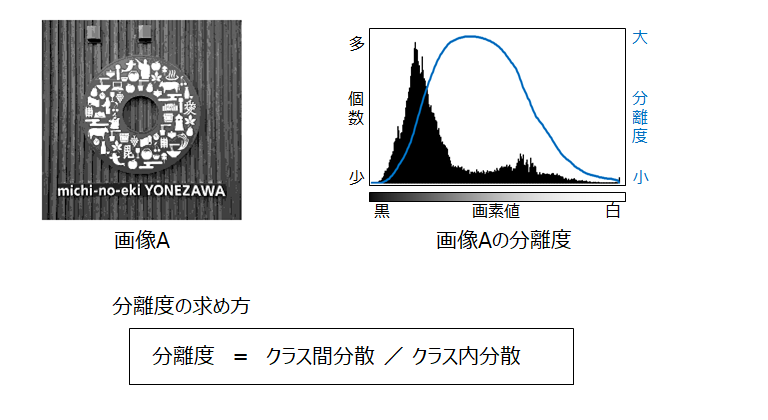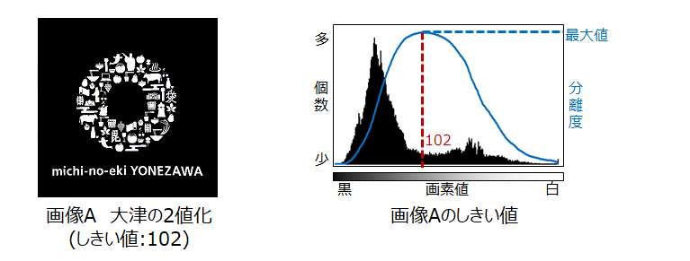 求めた分離度が最大の時の画素値を2値化しきい値とします。画像Aの場合、しきい値は102となります。