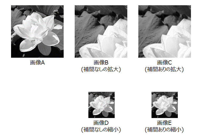 補間を行うことで、「画像C」や「画像E」のように拡大・縮小しても滑らかな画像をつくることができます。