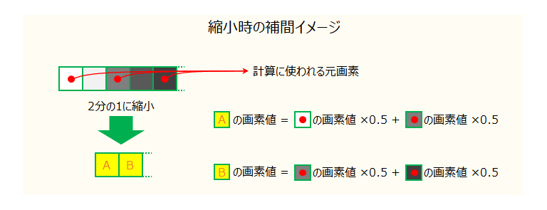 縮小する場合も同様に、元々の画素値を用いて計算し画素A・Bを求めます。