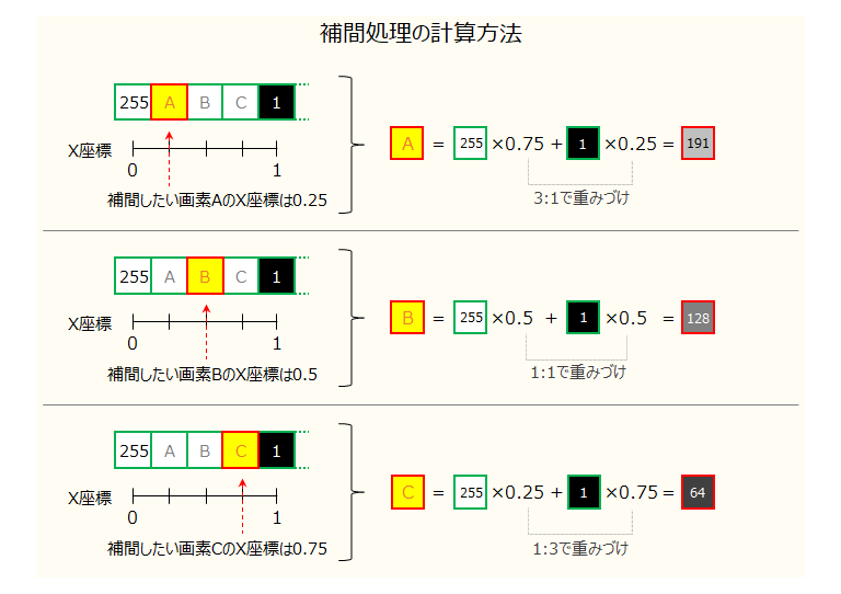 バイリニア補間ではこれらの補間を縦横方向に行います。