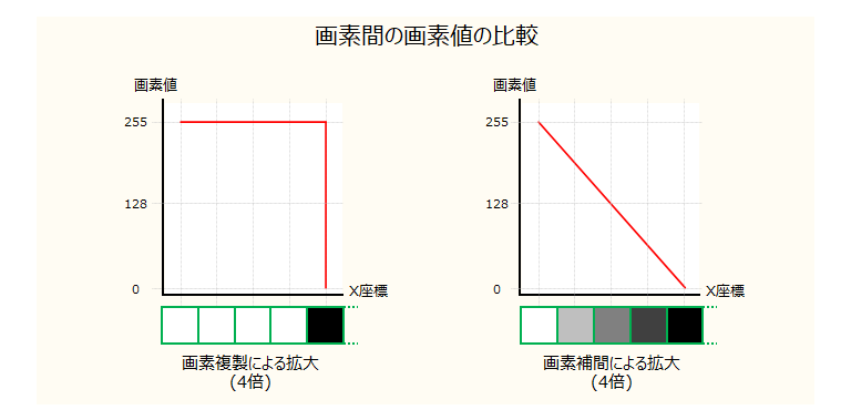 このような補間によって、拡大・縮小後の画素間の差が滑らかになることがわかります。
